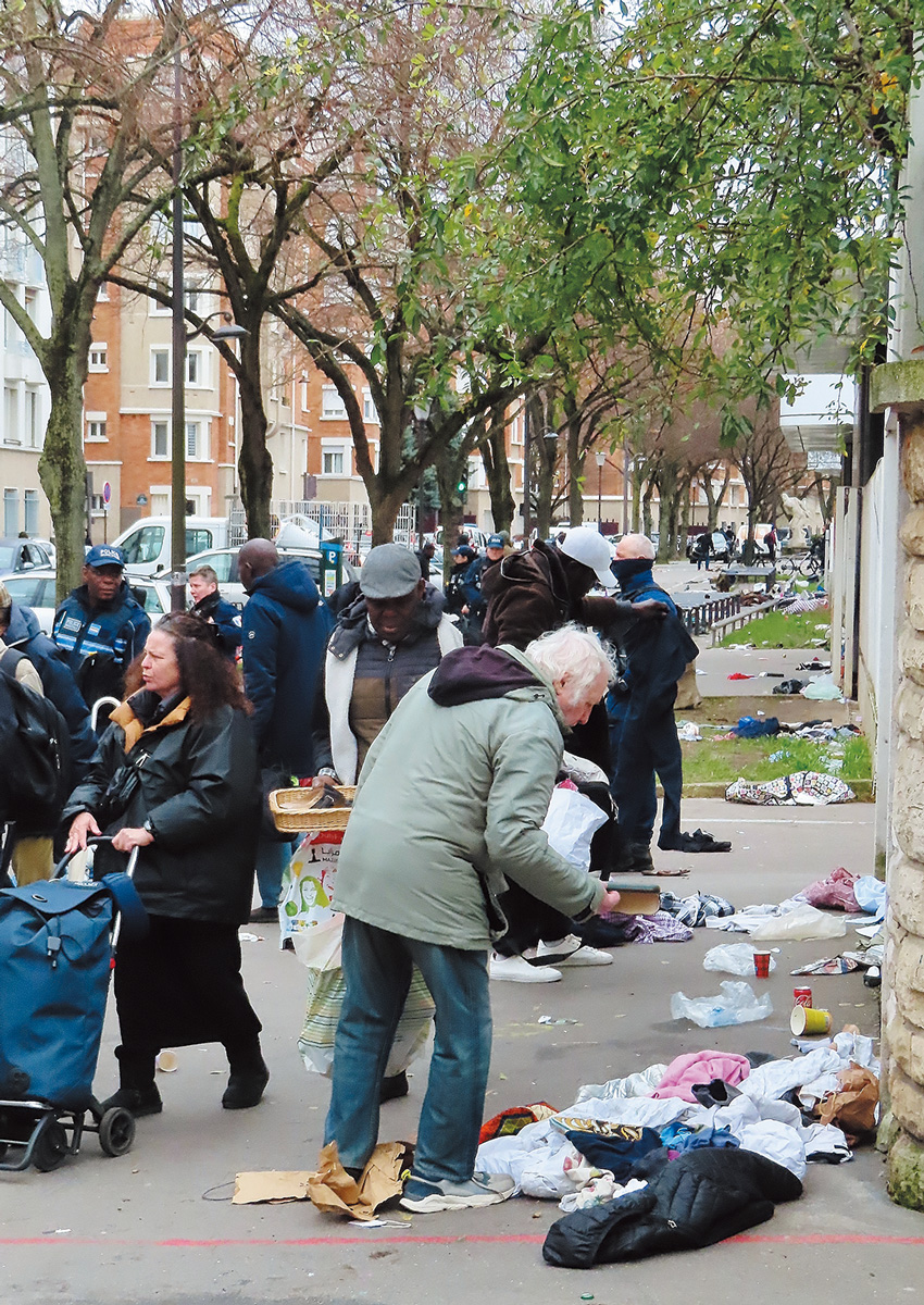 場所は、ポルト・ドゥ・ヴァンヴ駅からだと奥の方に位置する、環状線の上を通る鉄橋の上。無法地帯の雑多な空気感は、正規出店者が埋める地区とは全く異なり、まさに掃きだめです。皆さん、滞在許可証は持っていなさそうですし、人によってはパスポートさえ無いかもしれません。警察のパトロールが来ると、蜘蛛の子を散らすように一斉に逃げ、警察が去ると元の場所に戻って来て再び商売を始めます。でも最近は、近くの小さな公園の脇のスペースまでげ、そこで商売を始め、そこに再び警察が踏み込むと、また鉄橋の上に戻る、という戦法が編み出されました。写真は、鉄橋から公園脇に逃れて折角商品を広げたものの、警察の二度目の襲来により皆さんが逃げた後の様子で、白髪の男性は置き去りにされた商品を漁っています。そこにいる人々、それぞれが逞しい。